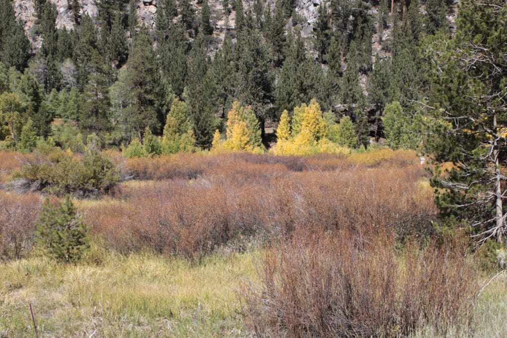 Color is showing up along the meadow across from Desolation Hotel. The trees that are changing here are mostly yellow-gold, but there’s one little patch of red-orange on the top of one grove.